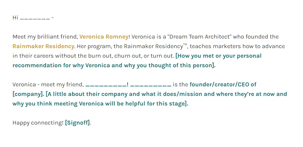 Veronica - meet my friend, _________! _________ is the founder/creator/CEO of [company]. [A little about their company and what it does/mission and where they’re at now and why you think meeting Veronica will be helpful for this stage].
